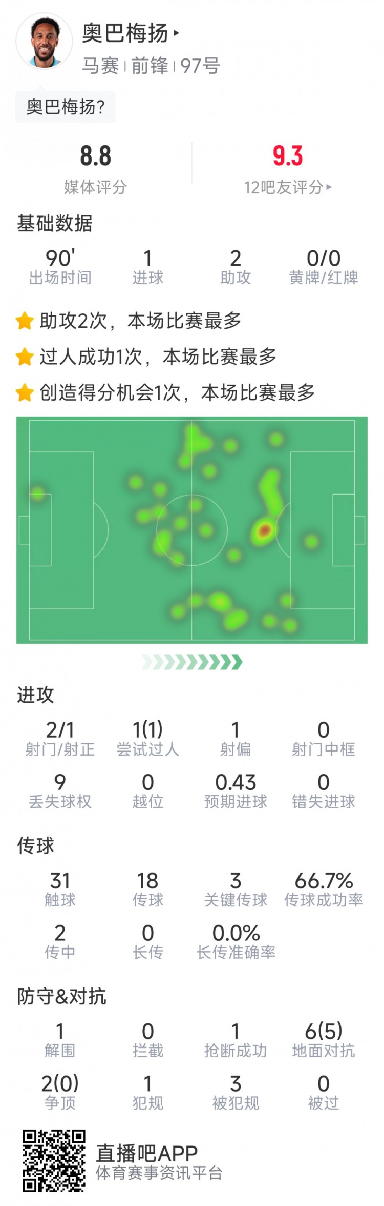 Trong vòng Champions League này, Marseille đã đánh bại Ajax 4-0. Aubameyang ghi 1 bàn và 2 pha kiến tạo trong trò chơi này. Sau đây là dữ liệu của anh ấy trong trò chơi này: 90 phút của thời gian trò chơi