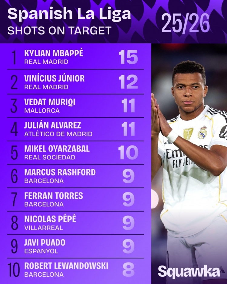 Xếp hạng của LA Liga Shots: MBappe xếp hạng 15 lần đầu tiên, Vinicius thứ hai, Spider Fourth